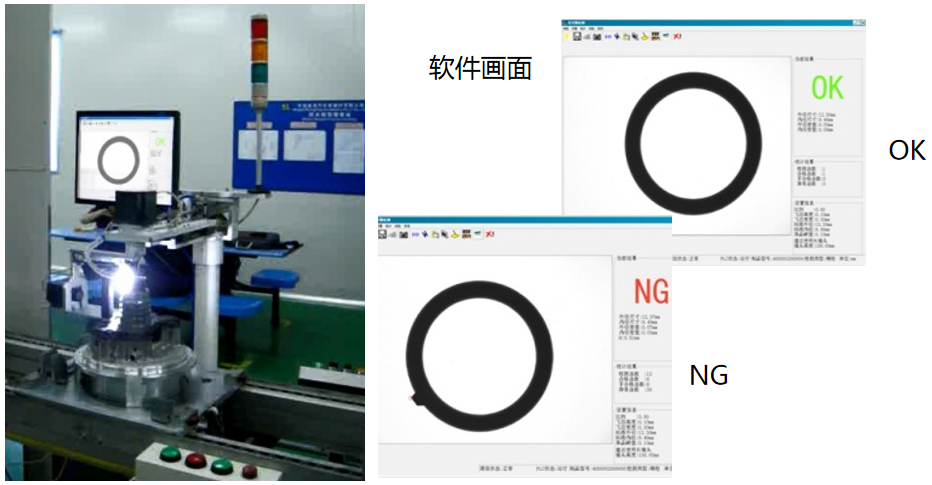 “密封圈缺陷視覺檢測系統(tǒng)”針對密封圈質(zhì)量(邊緣缺口毛刺、內(nèi)外徑尺寸)進(jìn)行檢測。相機(jī)快速采集生產(chǎn)線上密封圈圖像,將圖像數(shù)據(jù)傳送到圖像處理系統(tǒng),圖像處理系統(tǒng)對每幅圖像進(jìn)行預(yù)處理、尺寸測量等運(yùn)算,通過與標(biāo)準(zhǔn)模板圖像及設(shè)定參數(shù)進(jìn)行比較,來判斷產(chǎn)品是否合格,輸出廢品報警信息及剔廢控制信號,由機(jī)械系統(tǒng)剔除廢品,從而保證密封圈質(zhì)量。本系統(tǒng)主要應(yīng)用于各類規(guī)格密封圈生產(chǎn)過程中的缺陷檢測,并可延伸至相關(guān)產(chǎn)品或行業(yè)的應(yīng)用中。